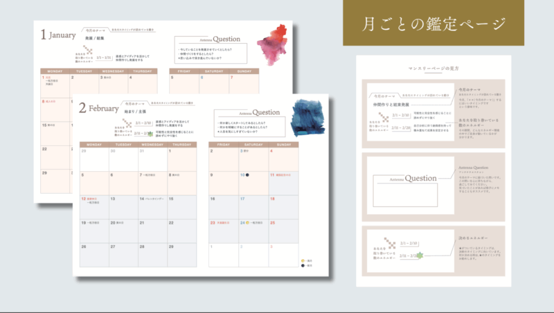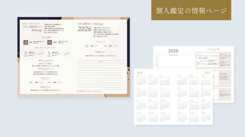 鑑定で受け取っていただいた個人鑑定の内容と今年のテーマを確認できるページがございます。