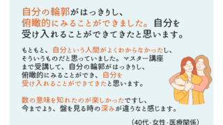【講座感想】自分の輪郭がはっきりし、俯瞰的にみることができました。自分を受け入れることができてきたと思います。