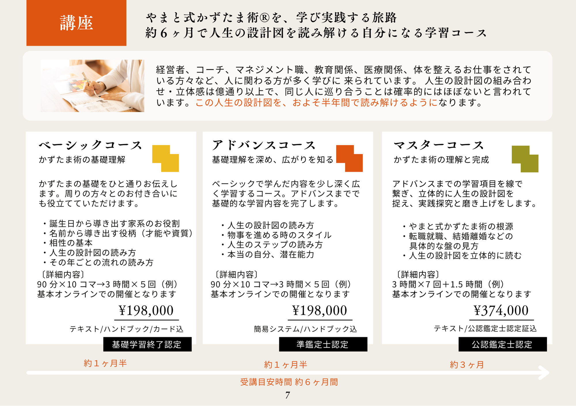 卒業後には、やまと式かずたま術を実践的に深めてゆく月に一度(2時間)の学習コースにもご参加いただけます。ご自身の学びを日常に落としたり、鑑定士として活動したりするのに実践的な力を身についてゆくことに役立ちます。